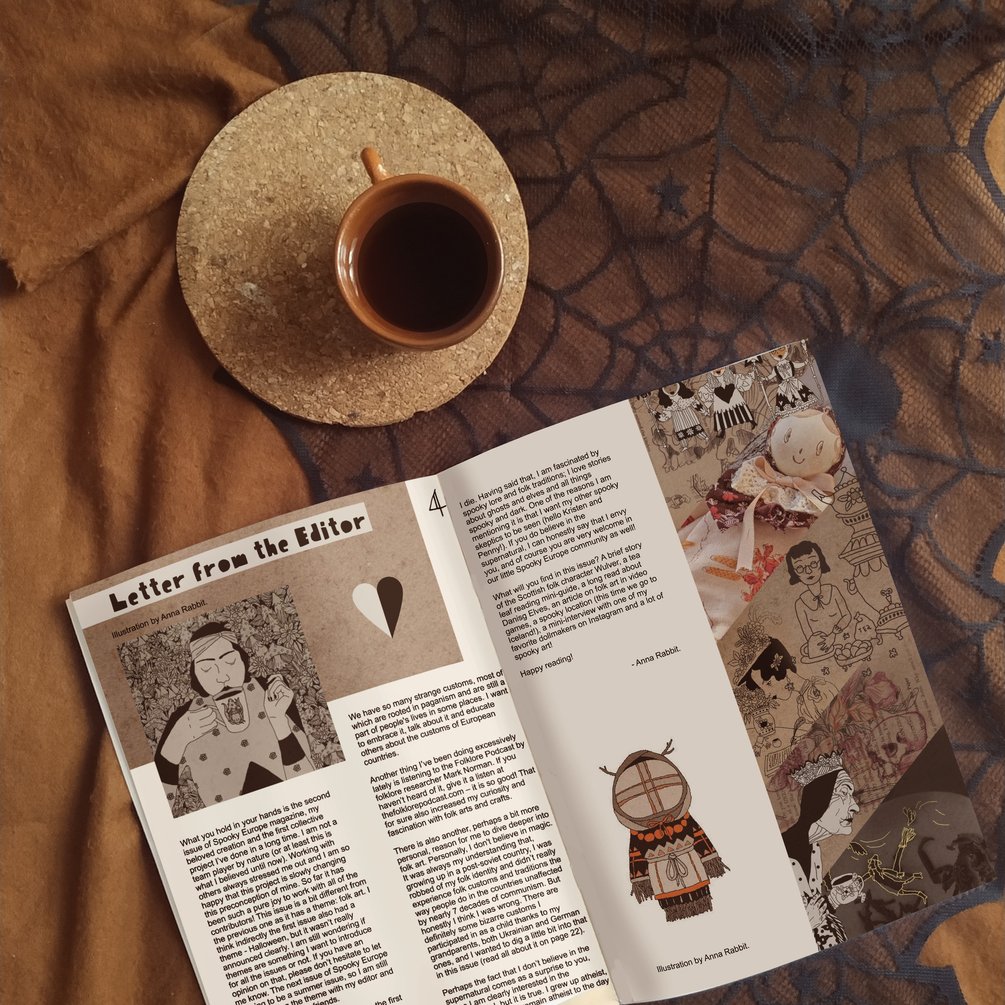 What will you find in this issue? A brief story of the Scottish folk character Wulver, a tea leaf reading mini-guide, a long read about Danisg Elves, an article on folk art in video games, a spooky location (this time we go to Iceland!), a mini-interview with one of my favorite dollmakers on Instagram and a lot of spooky art! Happy reading! - Anna Rabbit.